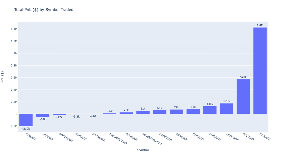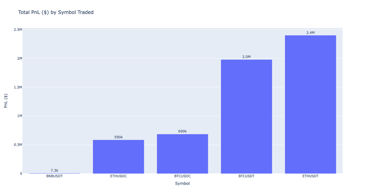 The figure below displays the TotalPnL ($) by symbol traded.
