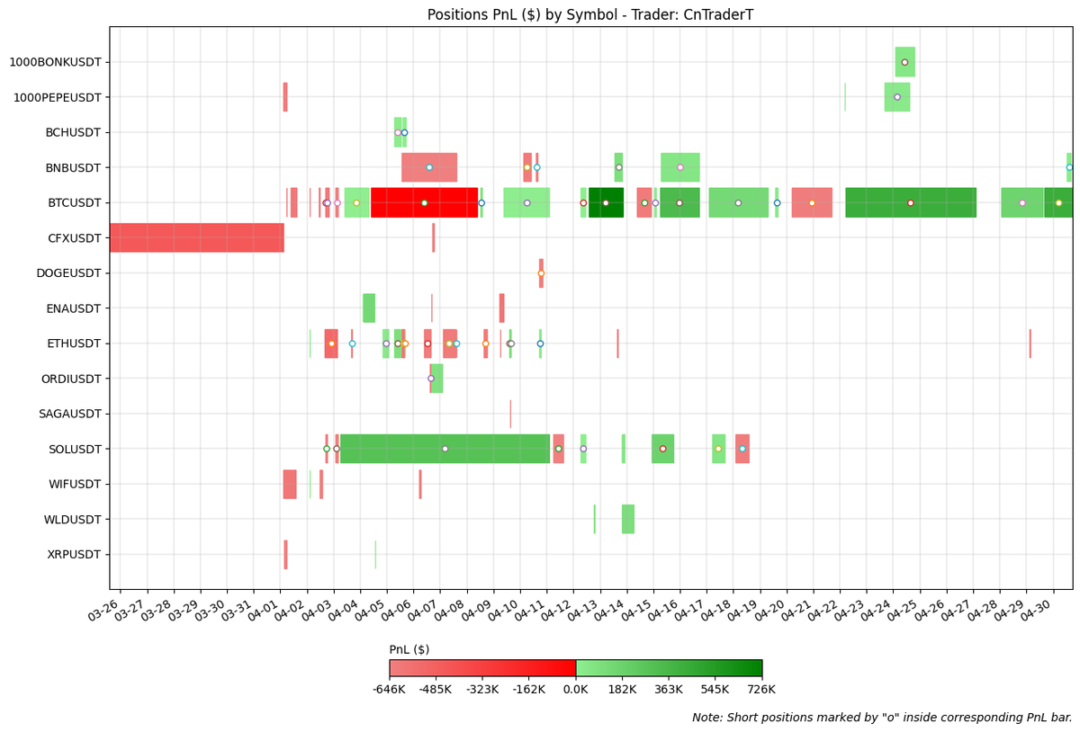 CnTraderT also maintained a large short exposure throughout the month. Unlike the other two traders, CnTraderT began taking positions at the start of April. Initially, this strategy faced challenges when $BTC bounced back about 9% between April 3rd and 8th, causing CnTraderT to be underwater by nearly $1 million.