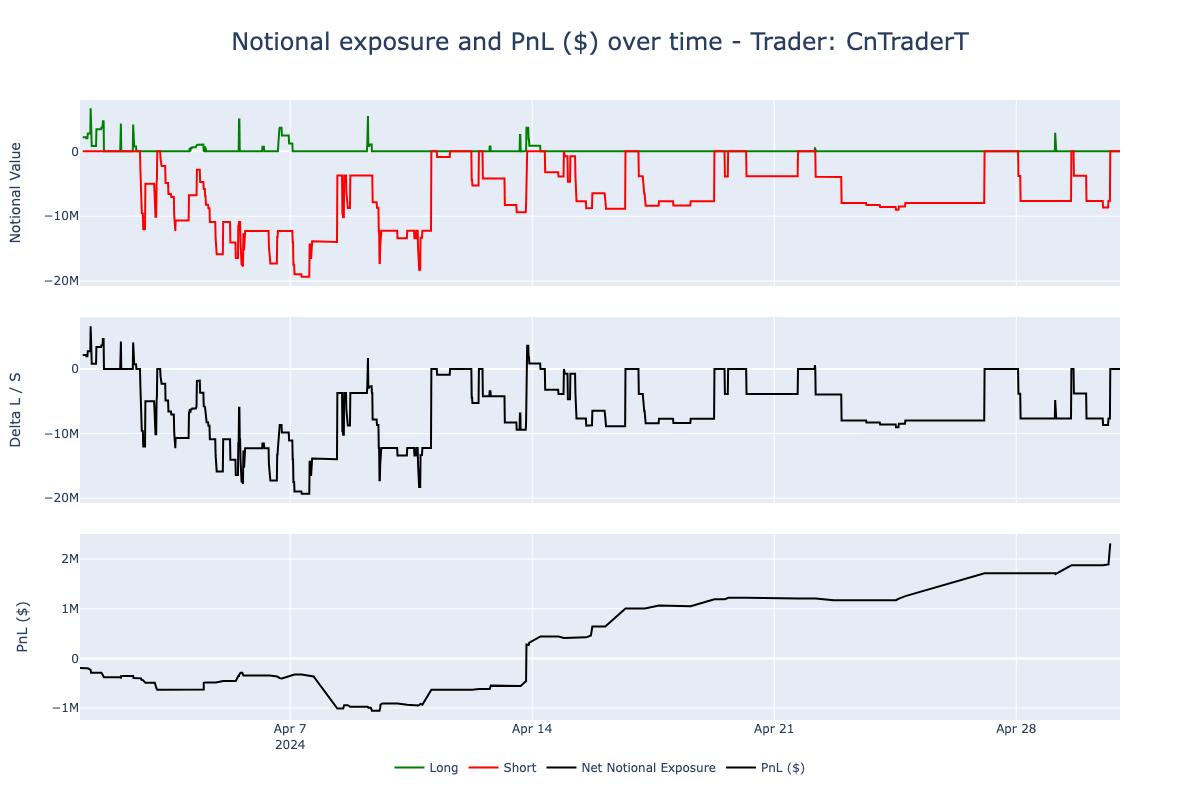 In terms of notional exposure, CnTraderT maintained an average short exposure of $10 million, peaking around $20 million. On the long side, he was much more conservative, with a maximum exposure of $5.8 million.