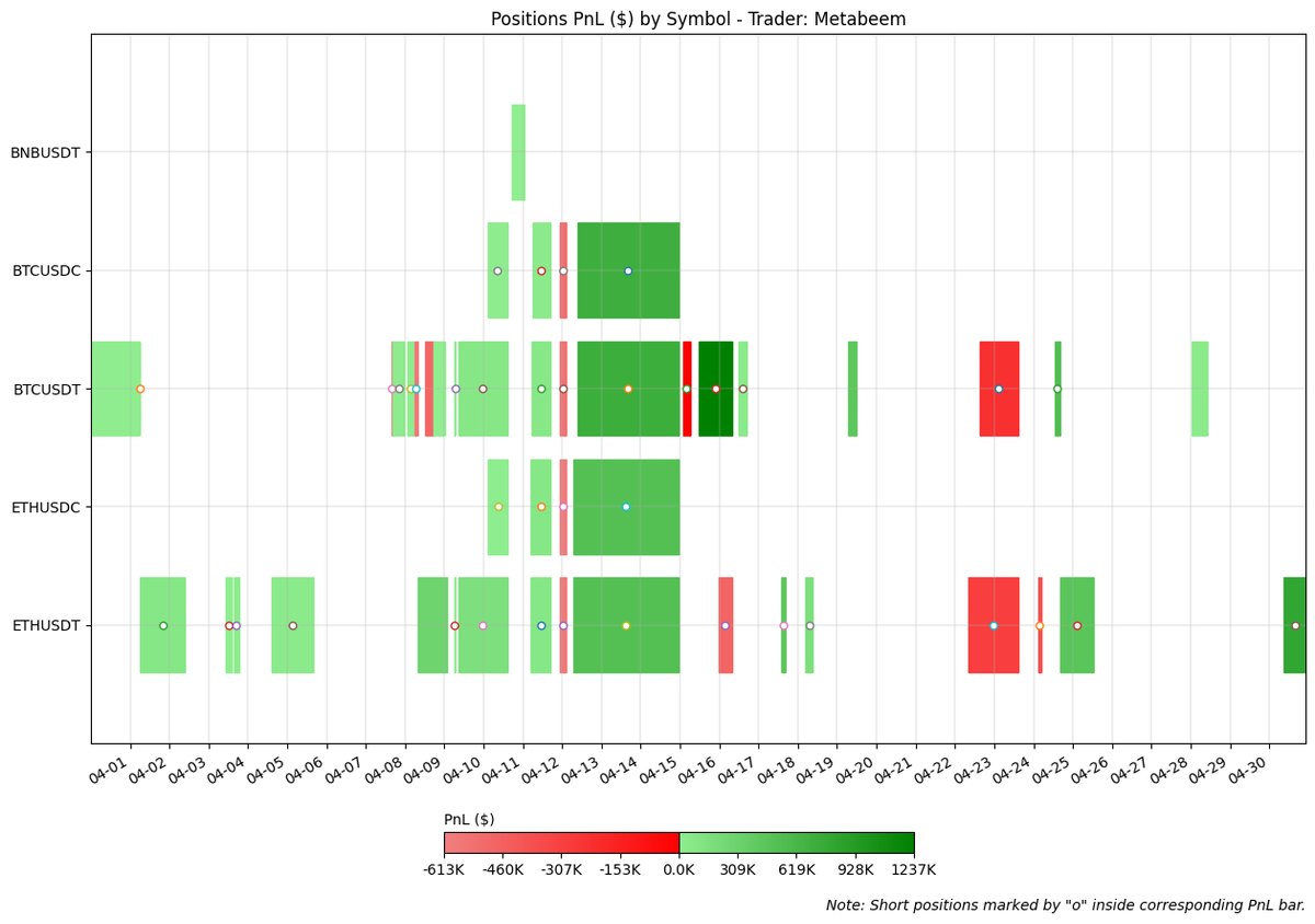 Most of the profits were generated between April 13th and 19th, during which Metabeem maintained a deeply net short position, successfully capitalizing on the market decline.
