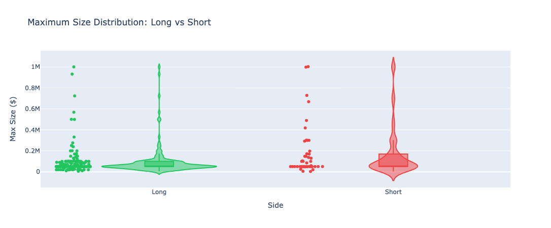 The distribution of maximum position notionals reinforces this balanced construction. Median notional exposure for both longs and shorts sits around $50k, and the tails of the distributions appear broadly similar, as illustrated by the violin plots; likely, a signal that position sizing is kept symmetrical across directions despite directional views at the symbol level.