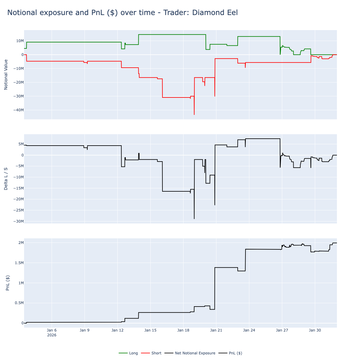 Diamond Eel started the month with a long bias, maintaining long notional around $8–10M and relatively modest short exposure near –$5M. His net exposure hovered around +$5M for the first ten days.