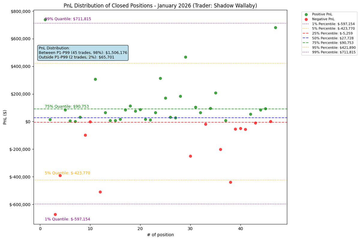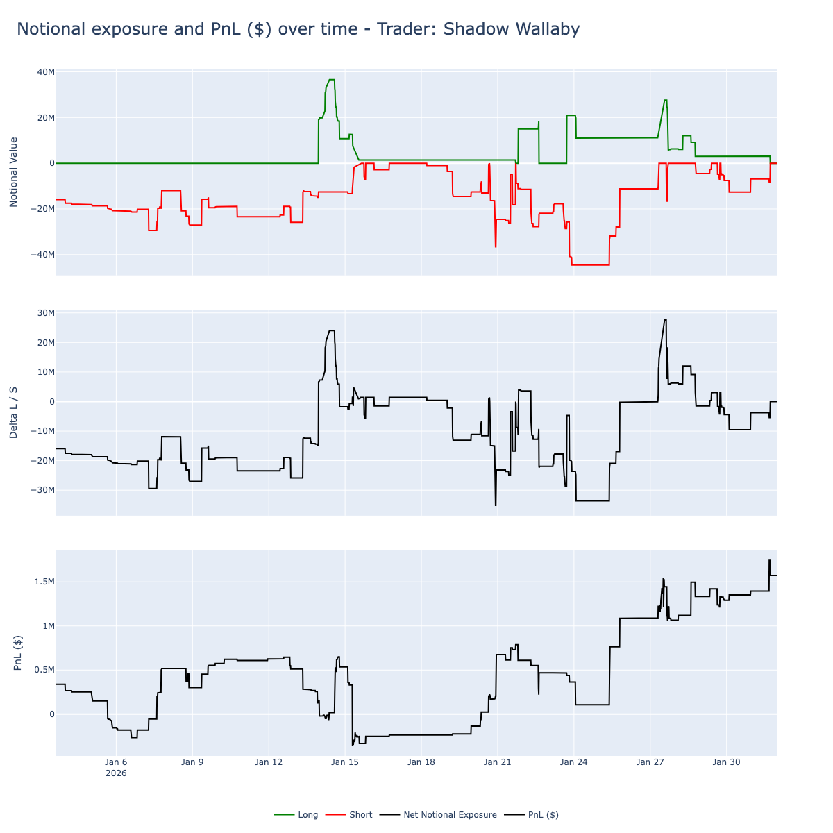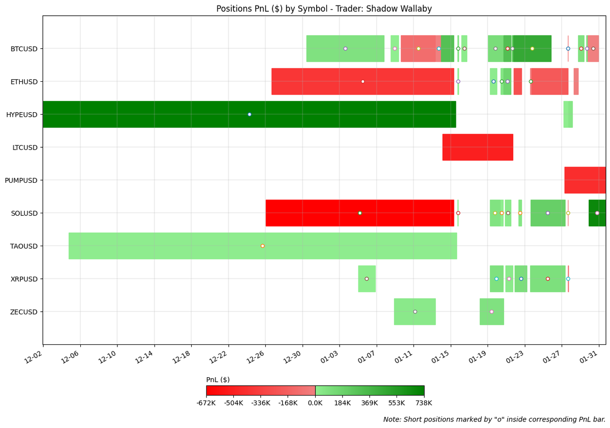 Shadow Wallaby showed the most dynamic positioning of the three. He began the month heavily net short, with short exposure around –$15M to –$30M and minimal long exposure for the first 12 days. Around January 13, he quickly flipped long, with long notional spiking to almost $40M and net exposure reaching approximately +$25M. However, this reversal was only temporary, by January 15 he rotated back to net short, and his PnL retraced into negative territory around –$200K. Through mid-month, he oscillated between net short and neutral, with PnL recovering to about $500K. The strongest performance came in the final week: from January 24, he built long exposure to nearly $30M, and his PnL accelerated from around $600K to over $1.5M by month end.
