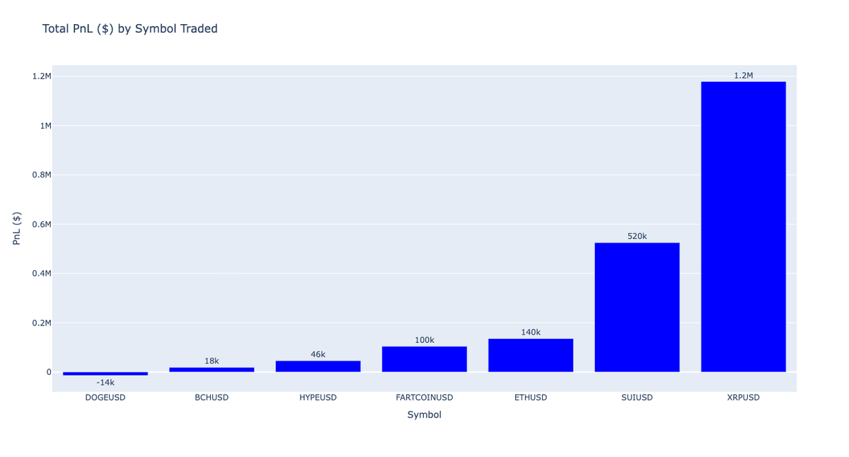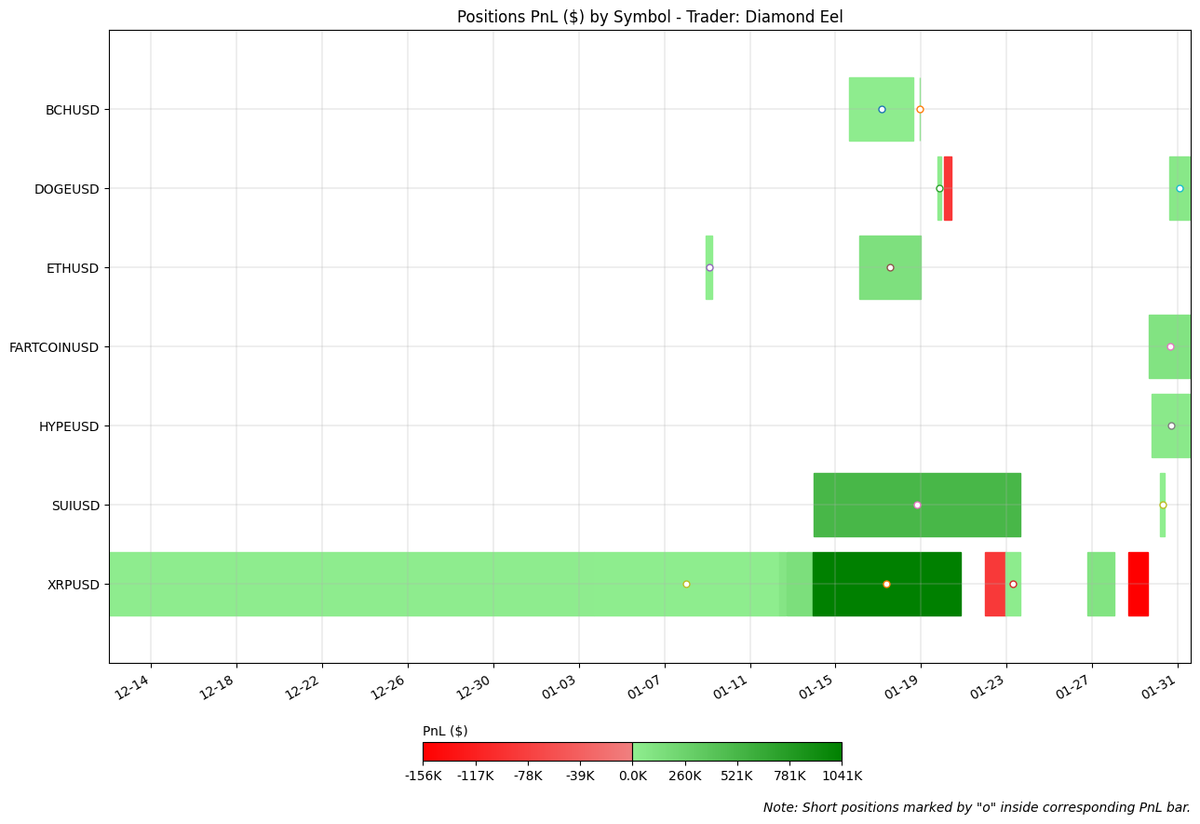 Looking at PnL by symbol, $XRP was Diamond Eel's dominant contributor at $1.2M, followed by $SUI at $520K, and together accounting for roughly 86% of his total monthly profit. He was profitable on six of seven symbols traded, with $DOGE being the only loser at –$14K.