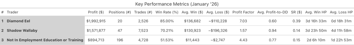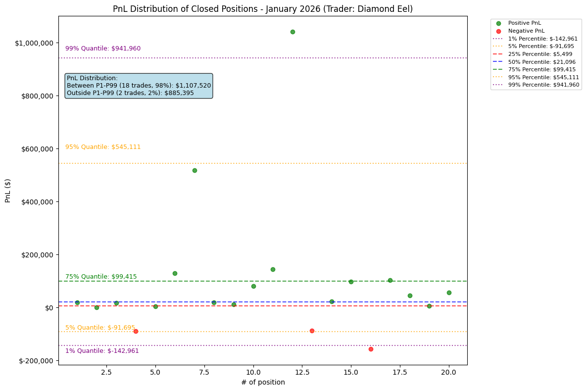 Diamond Eel led the month with nearly $2M in profit across just 20 closed positions, achieving the highest win rate of the three at 85%. His profit factor of 7 was also the strongest, reflecting a significant edge per trade. Average winners ($137k) were held for nearly 4 days, while average losers ($110k) were cut in under 19 hours. The average win/loss ratio of approximately 1.24, combined with the high win rate, produced consistent returns despite a modest number of positions.