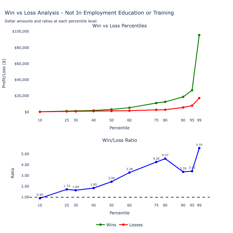 Finally, the win/loss percentile analysis reveals a consistent rising ratio across the distribution, pointing to a pronounced positive skew: losses remain contained while winners expand meaningfully in the upper percentiles.
