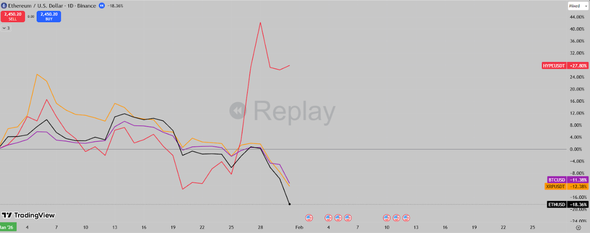 $ETH had it worse. After briefly touching $3,400 early in the month, it fell to a low of $2,250 and closed at $2,452, a 17.5% decline. The ETH/BTC ratio dropped 8%, continuing a trend of $ETH underperformance that defined much of the period. Altcoins were broadly weak, with early strength in names like $XRP fading quickly as the selloff deepened. The notable exception was $HYPE, which rallied hard from January 21 through month end, diverging from the broader market.
