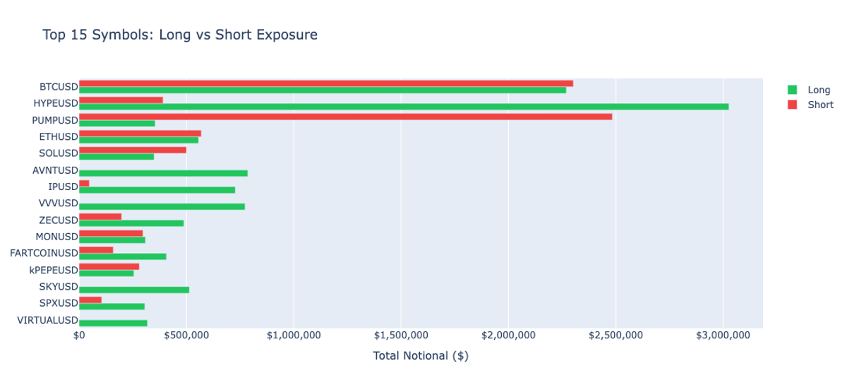 Looking at the top 15 symbols by total notional exposure, $BTC, $HYPE, and $PUMP dominated. $BTC was run with near-symmetric long and short exposure. $HYPE was heavily tilted toward longs, while PUMP showed the opposite pattern, with a clear preference for shorts.