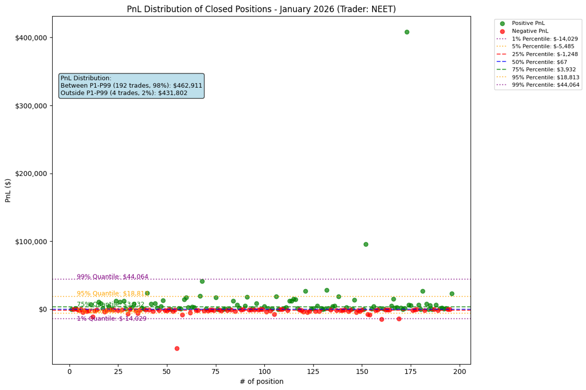 He showed a strongly positive-skewed distribution, with the 75th percentile at +$99K versus +$5.5K at the 25th, an 18x ratio. His median trade was +$21K, indicating that most positions were profitable on average. Looking at the contribution of outlier trades: positions outside the P1–P99 range accounted for $885K, or roughly 44% of his total realized PnL, while the remaining 18 trades within P1–P99 contributed $1.1M. This means nearly half of his monthly profit came from just two positions.