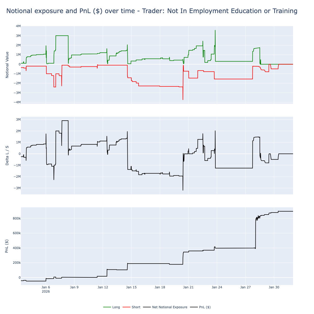 Not In Employment Education or Training (NEET) operated at much smaller notional than the other two, with long exposure typically between $500K and $2M and short exposure rarely exceeding –$3M. His net exposure fluctuated frequently between roughly +$3M and –$3M, with the portfolio consistently maintained in a long/short-hedged configuration.