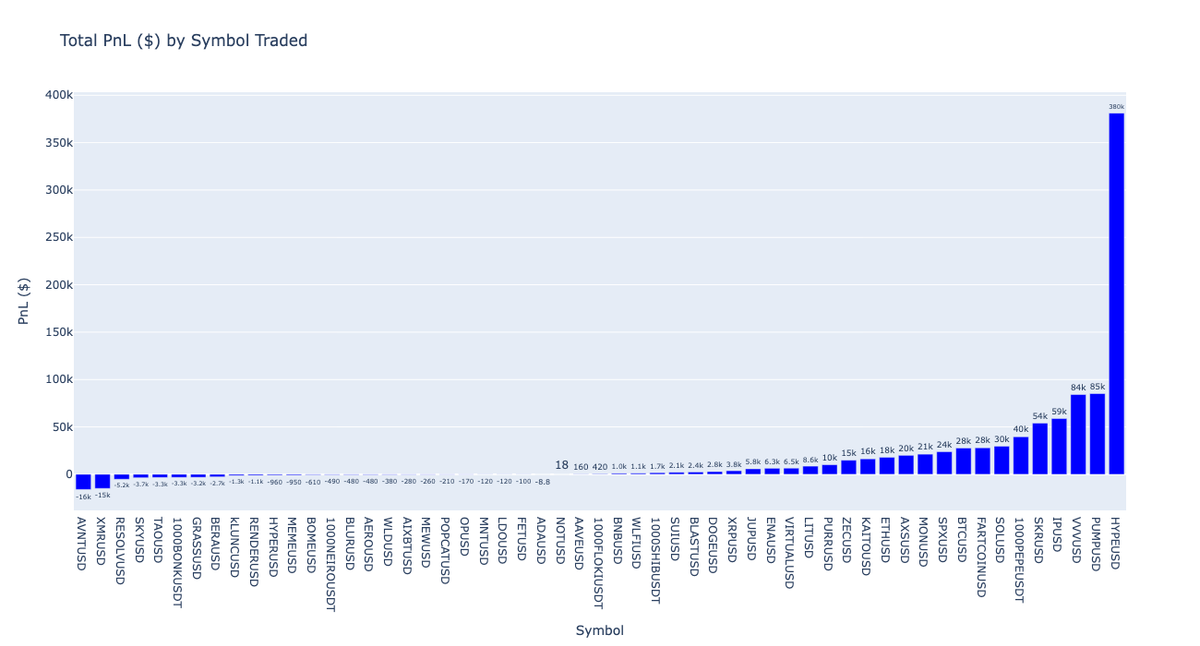$HYPE was the most profitable symbol for NEET, contributing $380K, roughly 42% of his total monthly PnL. Beyond that, profits were spread across a long tail of smaller winners, with $PUMP ($85K), $VVV ($84K), and $IP ($59K) the next largest. Losses were minimal, with no single symbol exceeding –$16K.
