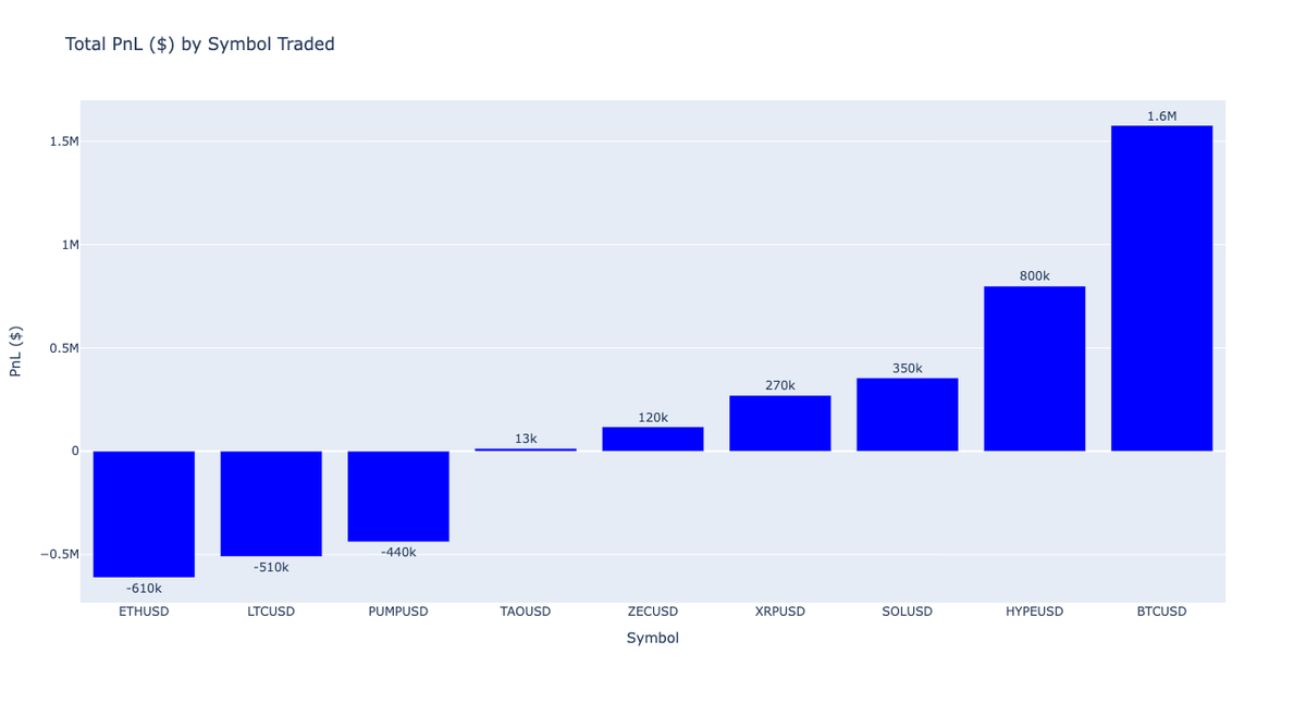 His top three contributors were $BTC (+$1.6M), $HYPE (+$800K), and $SOL (+$350K), totaling $2.75M in profits. However, this was partially offset by significant losses on $ETH (–$610K), $LTC (–$510K), and $PUMP (–$440K), which combined to –$1.56M. The winning side was roughly 1.8 times larger than the combined losses.