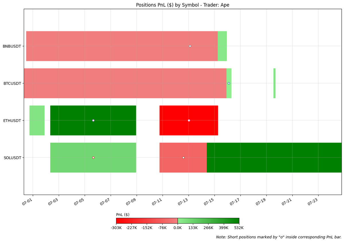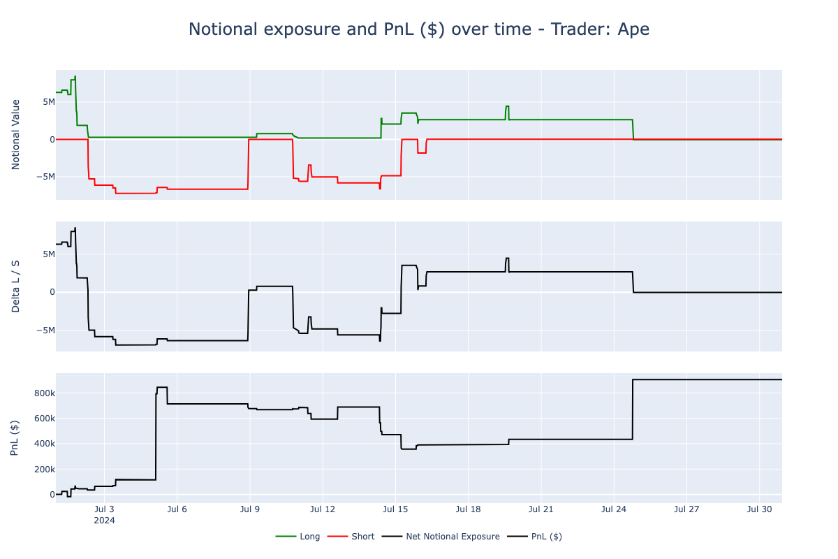 In July, Ape's exposure typically fluctuated between -$5M and just under +$5M. He maintained a net short position during the first half of the month, reaching a peak PnL of $800k. However, between July 15th and July 25th, he gave back half of these gains, only to recover them by the end of the month, ultimately closing with a profit of approximately $900k.
