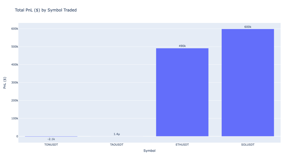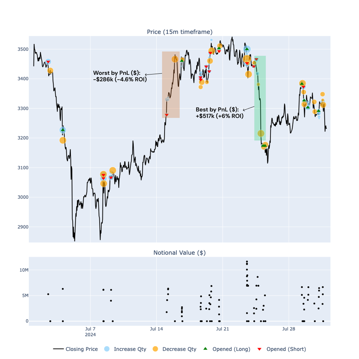 The largest loss occurred on July 15th, when a short position with a maximum notional exposure of $6.3 million resulted in a $286k loss, equating to a -4.5% ROI and contributing 4.6% to the overall PnL. After a series of minor gains and losses, TRADERT22 successfully captured another short on July 24th as $ETH experienced a nearly 7% drop within a day. With a maximum exposure of $8.6 million, this trade yielded a $517k (6% ROI) in just 12 hours.