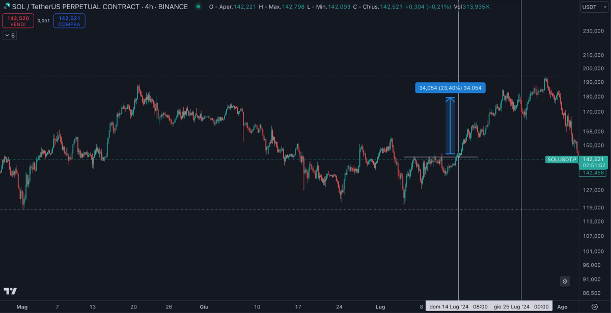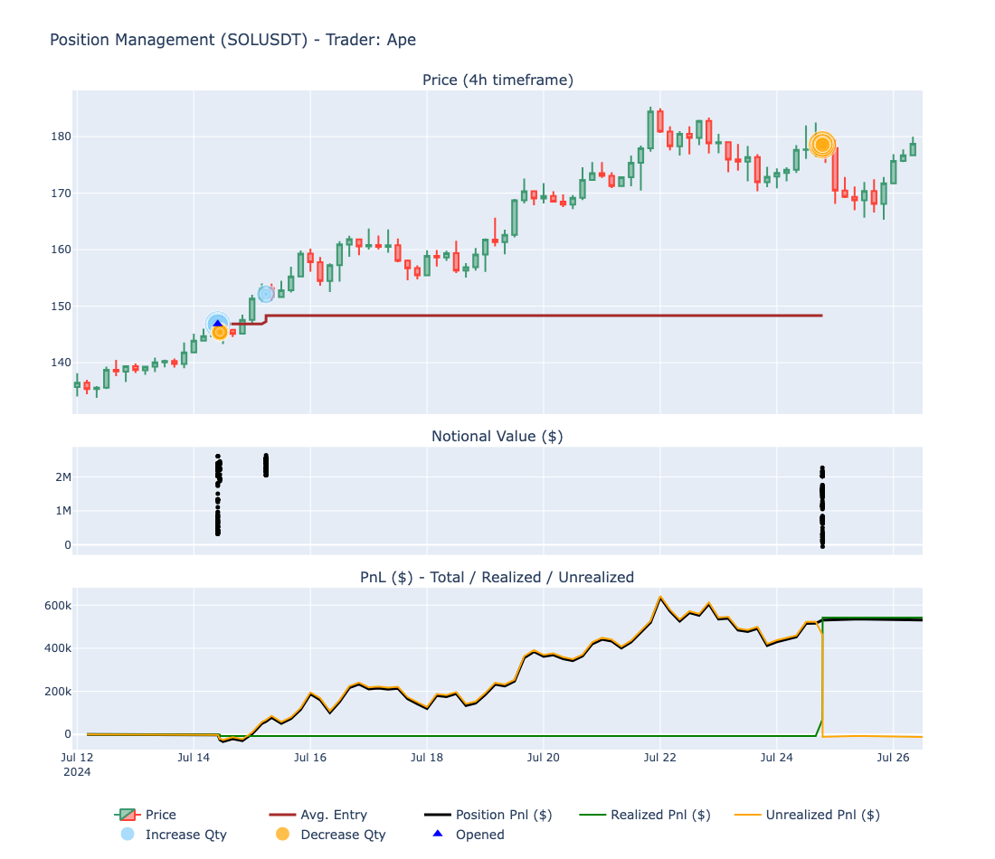 The $SOL long trade was Ape's second-best trade of the month, earning him a profit of $531k against a maximum drawdown of $33k, resulting in a remarkable 16x profit-to-drawdown ratio. Ape initiated this long position on July 14th, likely aiming to capitalize on a breakout from the 4-hour resistance area around $140.