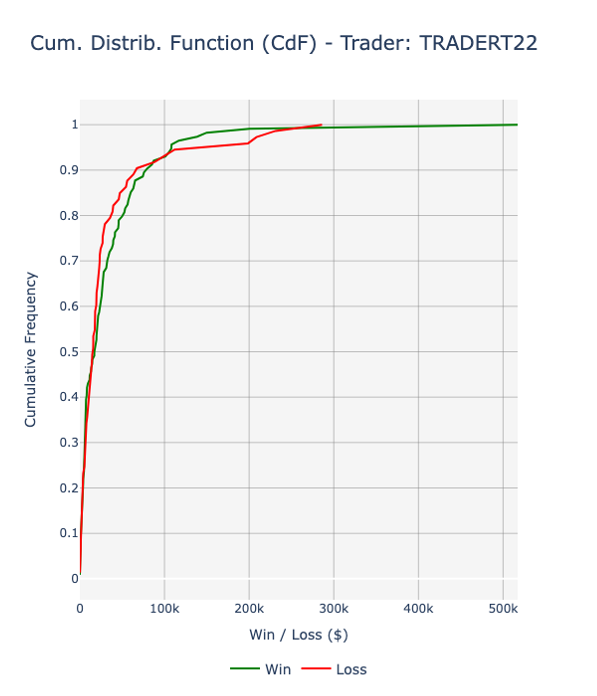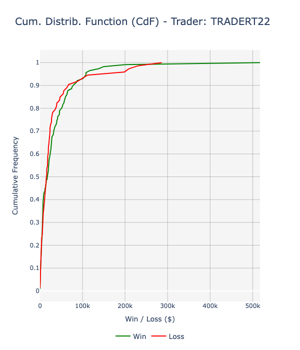 The cumulative distribution function (CdF) of his PnL is slightly positively skewed (skewness: 1.76), with a positive edge since the 50th percentile:
