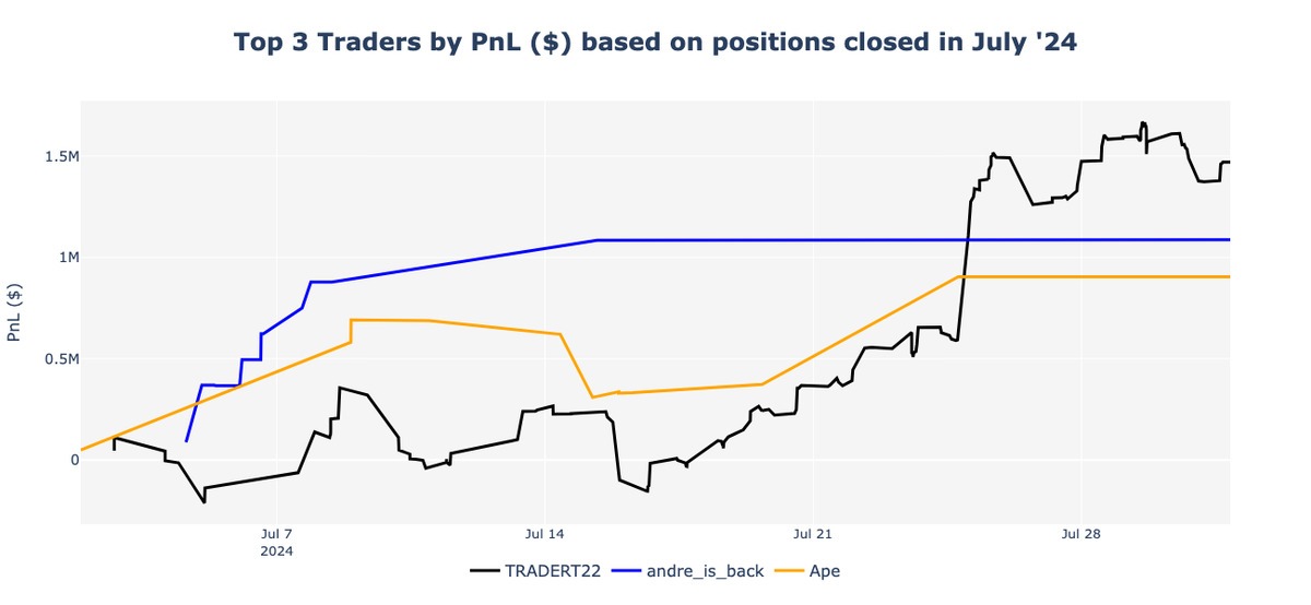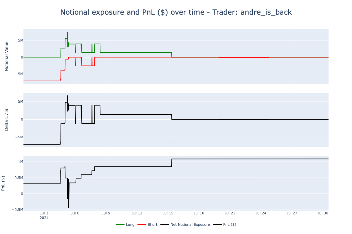 As for andre_is_back, most of his trading activity occurred during the first half of the month. He initially held a significant short exposure of over $5 million but shifted to a predominantly net long exposure until July 15th. Of the 17 positions he closed, approximately 53% were longs. Despite a rough start, with his PnL dipping to a nearly $500k loss, andre_is_back managed to recover and end the month with over $1 million in profits.