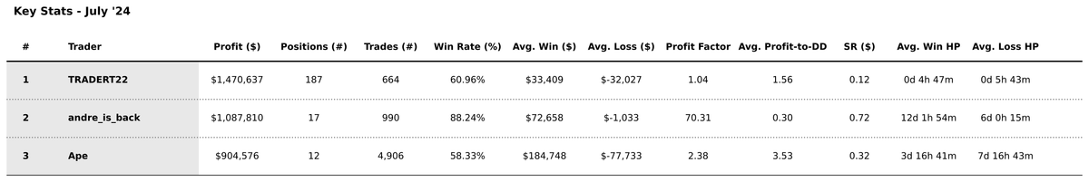 Lastly, Ape closed 12 positions but engaged in nearly 5,000 trades, boasting the highest Profit-to-Drawdown ratio at 3.53. Interestingly, his average holding period for winning positions was half that of his losing positions, which is uncommon based on what we saw in the previous reports.