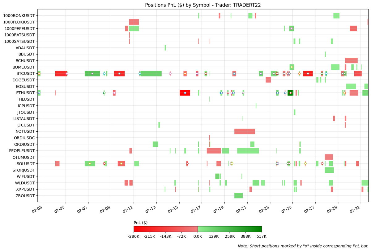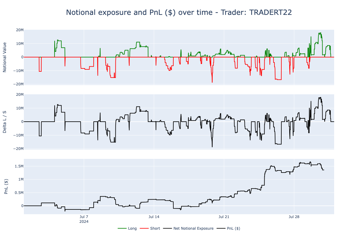 The notional exposure chart reveals that TRADERT22 frequently alternated between long and short positions, with exposure fluctuating between -$20 million and +$19 million. His PnL curve remained close to breakeven for the first half of July, with all significant profits ($1.4 million) being generated during the final two weeks of the month.
