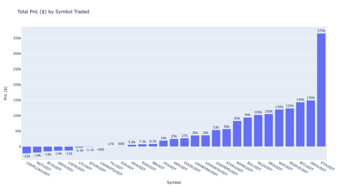 In July, TRADERT22 traded a diverse range of 29 symbols, balancing between major cryptocurrencies like $BTC and $ETH and meme coins such as $BONK, $FLOKI, $PEPE, $RATS, and $SATS. Despite this variety, $BTC emerged as the primary symbol traded throughout the month, although most of the profits came from $ETH (see following image).