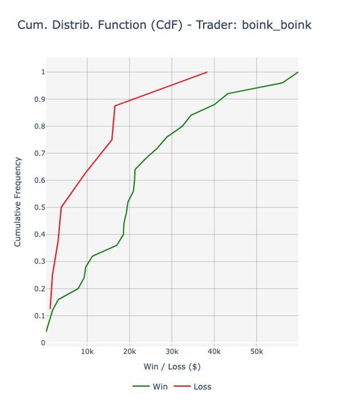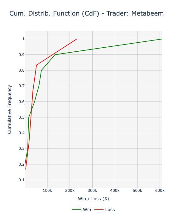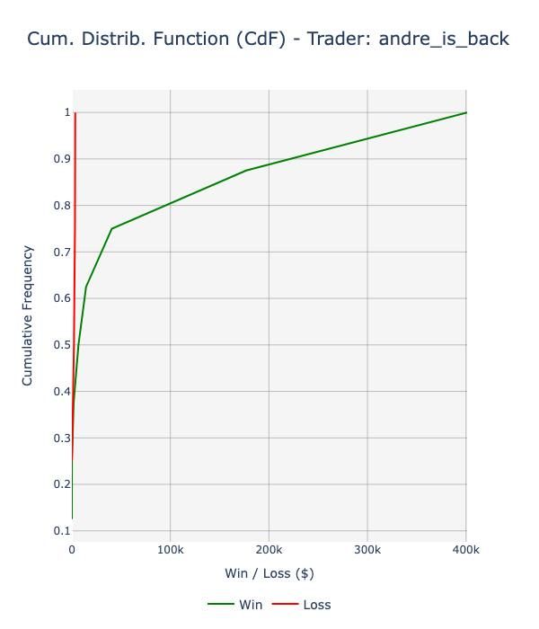 The cumulative distribution function (CdF) of his PnL is positively skewed (skewness: 2.31), with a positive edge since the 60th percentile: