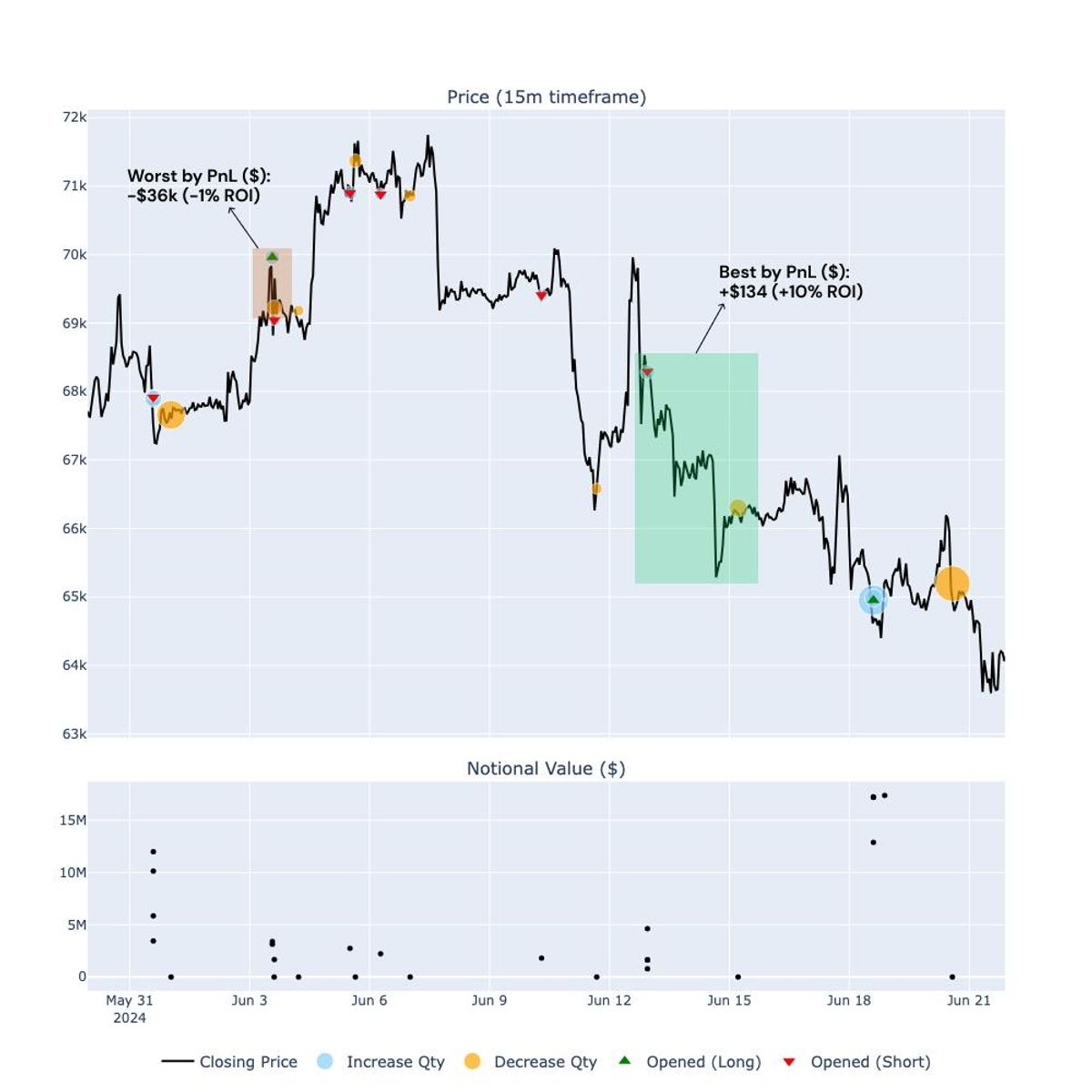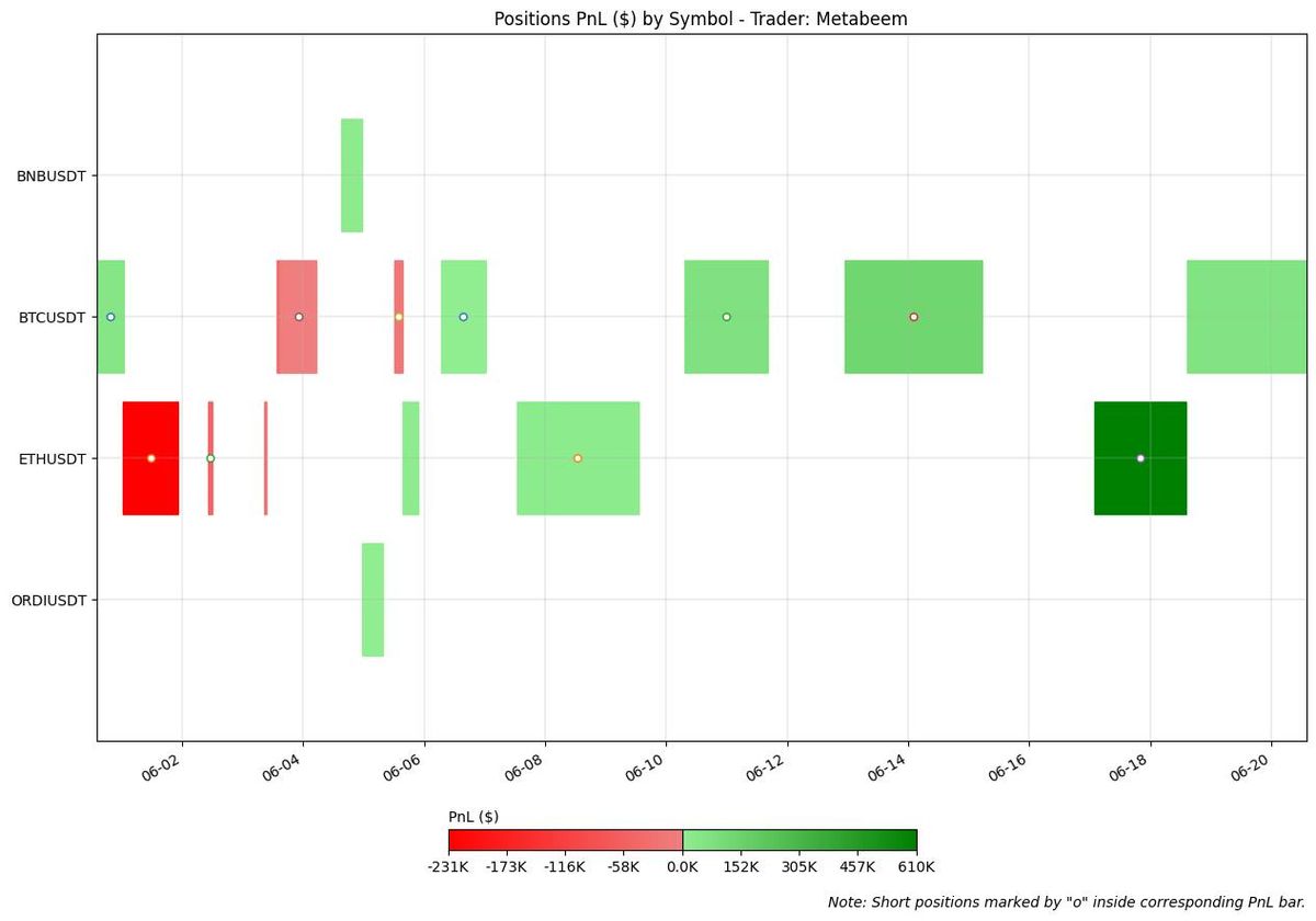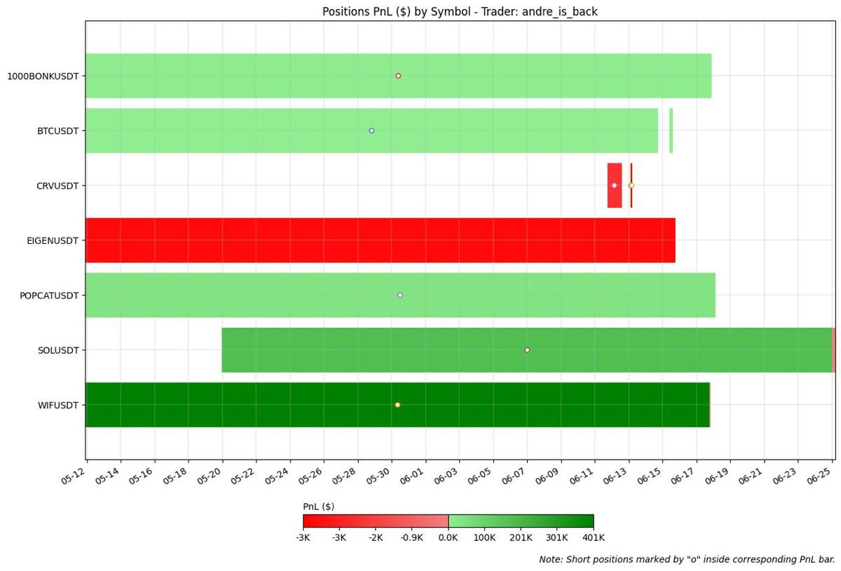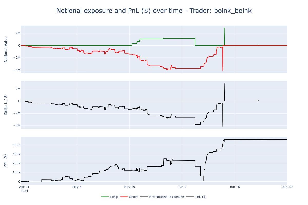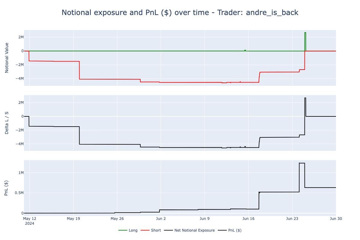 andre_is_back’s trading activity was predominantly short-biased, maintaining a short exposure for the majority of May and June, reaching a peak notional exposure of over -$4 million. Most of his profits were generated after mid-June, when he began covering his positions and taking profits.