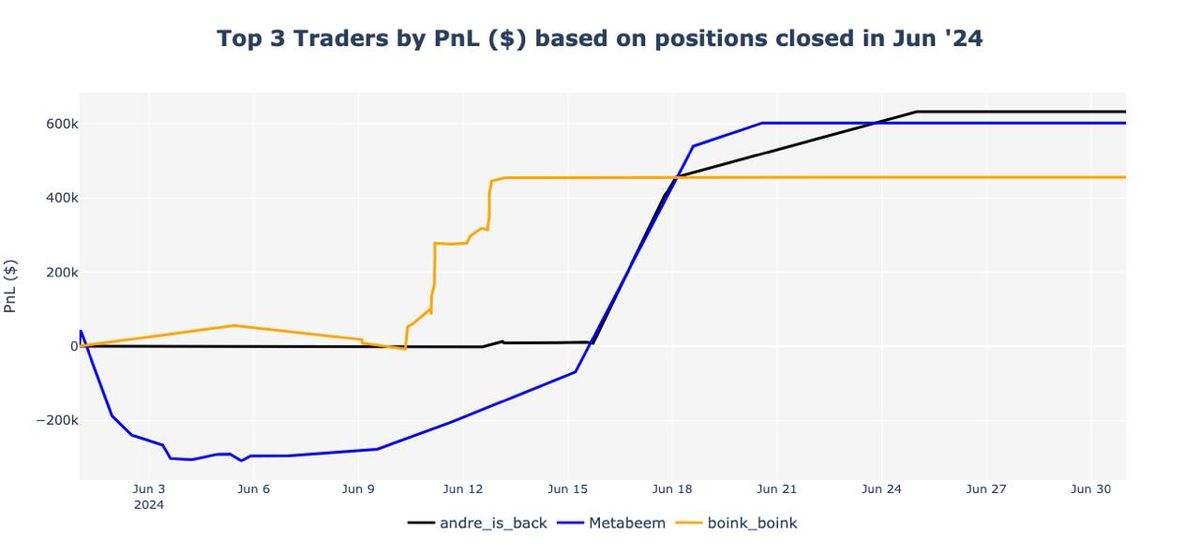 Leading the pack was andre_is_back from Hyperliquid, who climbed from second place last month to finish June with a total profit of $633k. In second place, Metabeem was initially facing losses until mid-month but successfully turned the tide, ending with a profit of $603k. Finally, boink_boink achieved a steady increase in PnL with minimal drawdown, closing the month with around $456k in profits.