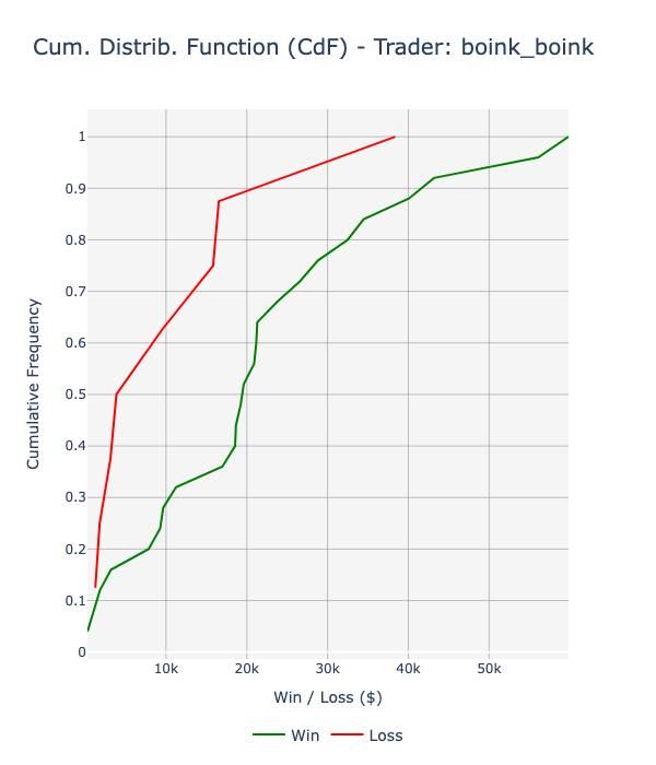 The cumulative distribution function (CdF) of his PnL is slightly positively skewed (skewness: 2.31), with a positive edge since lower percentiles: