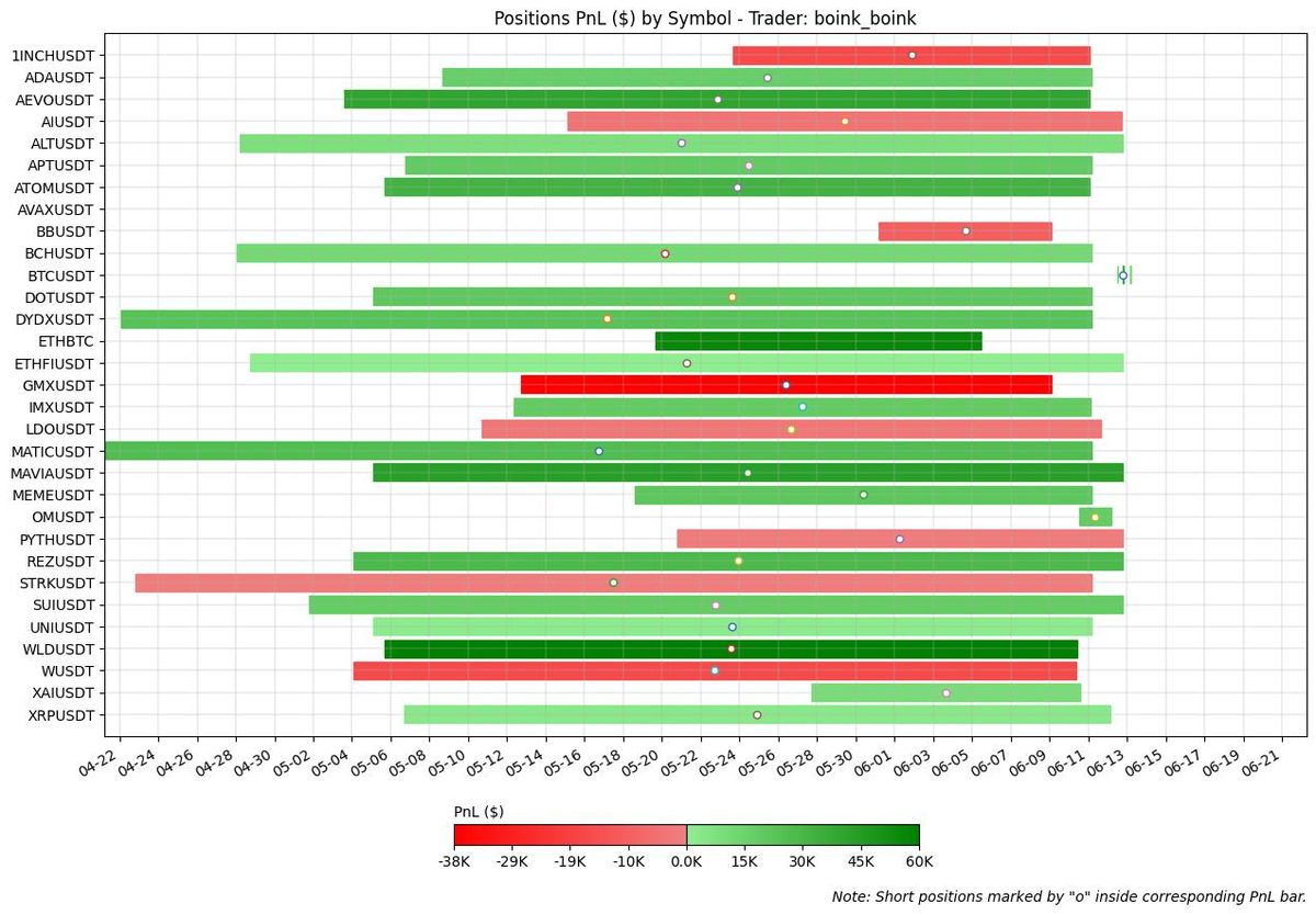 The figure below displays, for each closed position in June ‘24, the PnL ($) by symbol traded and their holding period.