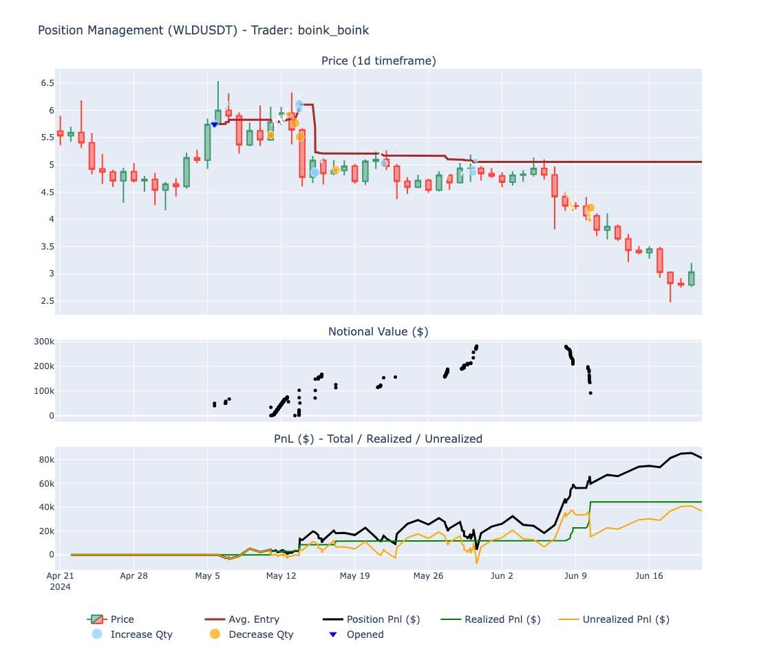 Notably, boink_boink managed to keep his average entry price above the $WLD price while incrementally increasing his position from $6 to $5. As the price started to decline and broke the support area, he began taking profits. This strategy likely allowed boink_boink to start with a smaller, lower-risk position and increase his size as the price moved in his favor, ultimately resulting in a larger, profitable position.