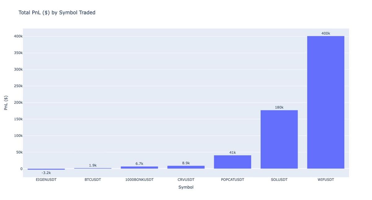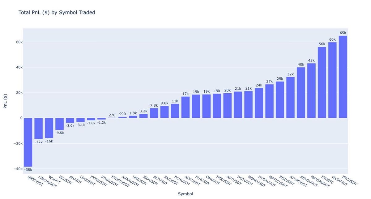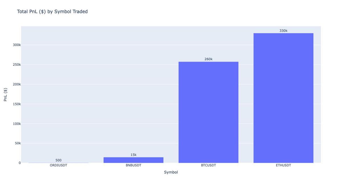 The figure below displays the TotalPnL ($) by symbol traded.