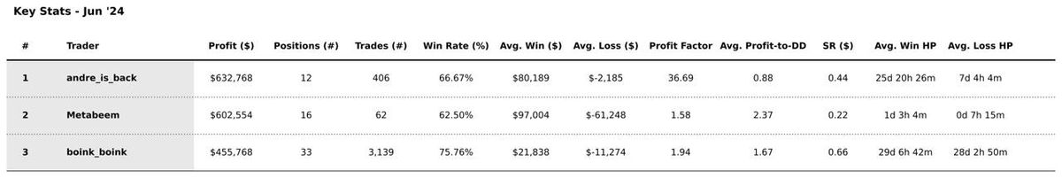 Finally, boink_boink closed 33 positions in June, executing the highest number of trades at 3,139. He holds the highest Win Rate at 75.8% and maintains the longest average holding period, around a month for both winning and losing trades.