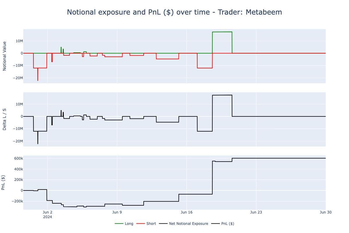 Metabeem had a challenging start to the month, being underwater by over $200k until mid-June. However, he managed to recover all losses and closed the month with approximately $600k in profit. Like other top traders, he maintained a predominantly short exposure, with notionals ranging from -$20 million to $17 million. Notably, Metabeem varied his notional exposure, going to extremes only in certain situations, likely when he had a stronger market view and greater conviction. His most profitable position was a short on $ETH, yielding a profit of $610k and enabling him to recover his losses and end the month in profit.