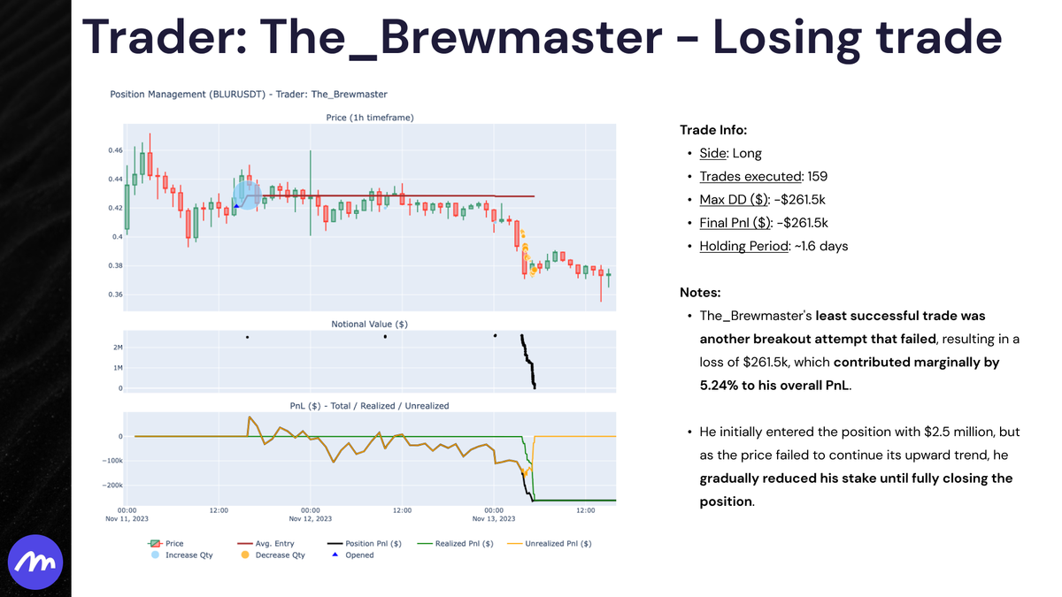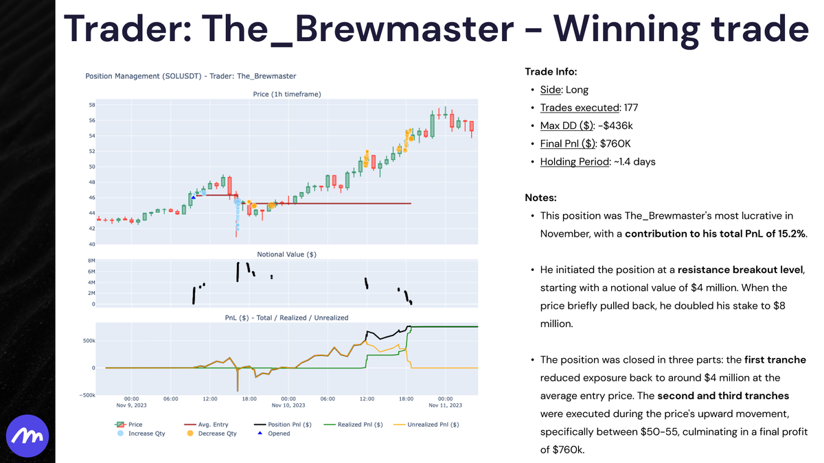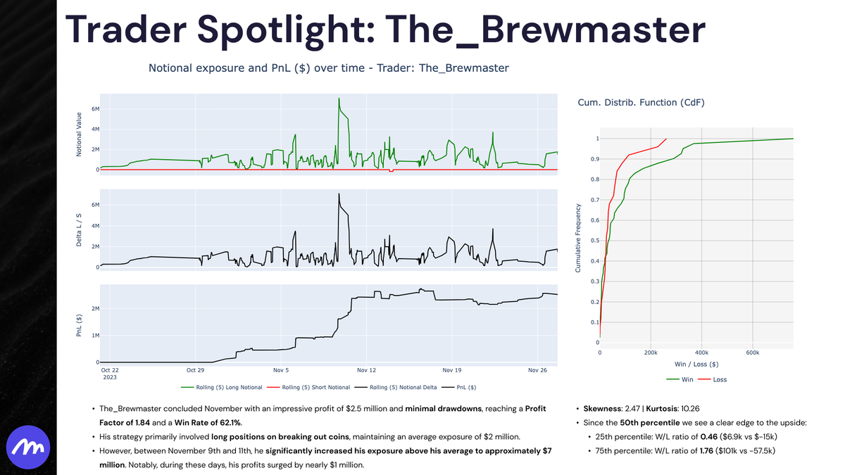 - This month, in terms of performance, Brewmaster stands out as our top pick. His ability to generate a staggering $2.5 million profit with an average exposure of just $2 million is particularly noteworthy, especially when contrasted with User-10db33's $373k profit from a significantly higher exposure range of $5-15 million. This comparison underscores Brewmaster's exceptional efficiency and skill in the market.