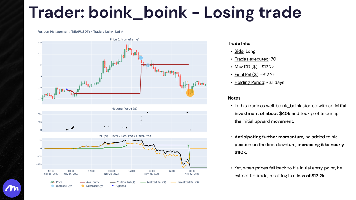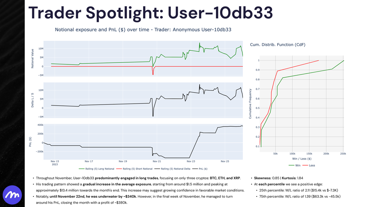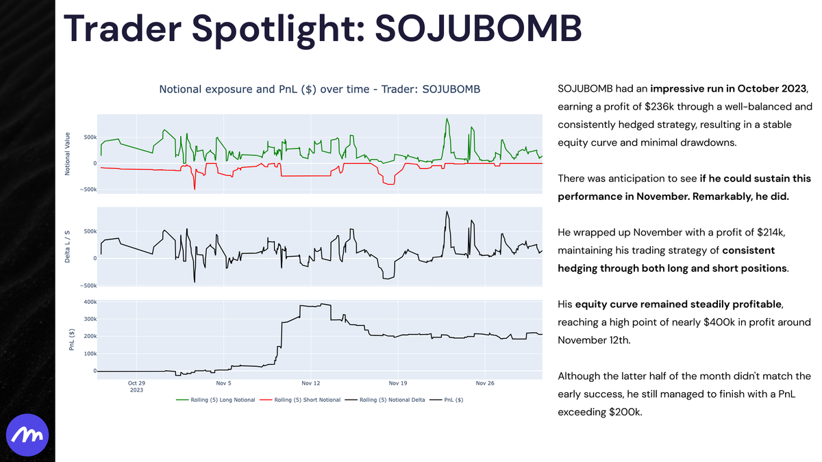 Despite ending the month with a profit of $373k, his performance metrics were not as impressive compared to his peers. He spent the first half of the month in a $340k drawdown, only recovering into profitability in the latter half.