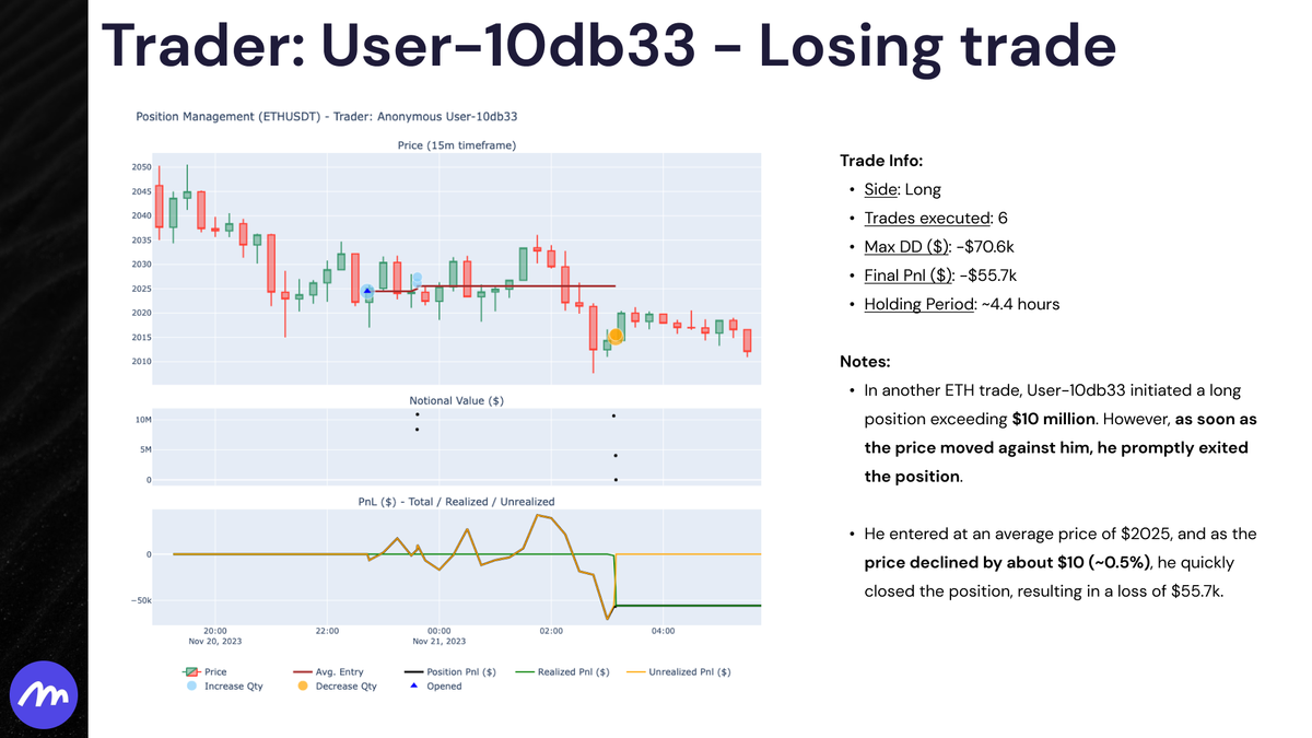 Moreover, his total profit was modest relative to his average exposure, which ranged between $5 to $15 million. This outcome can likely be attributed to his strategy of quickly closing both losing and winning positions.