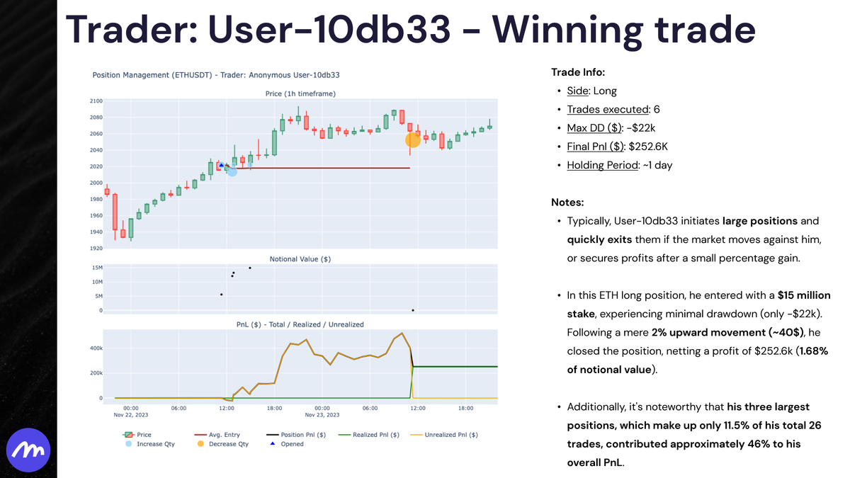 Notably, for his most successful trade, which significantly contributed 15.2% to his total PnL, he substantially increased his exposure to approximately $8 million.