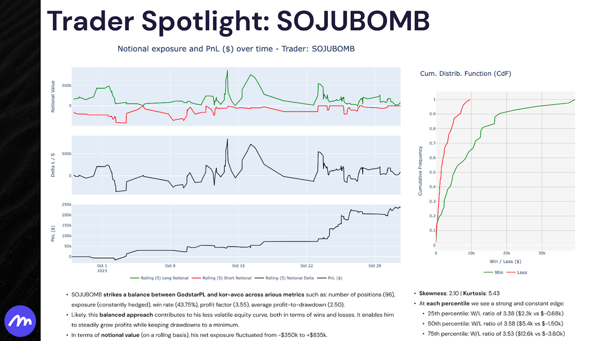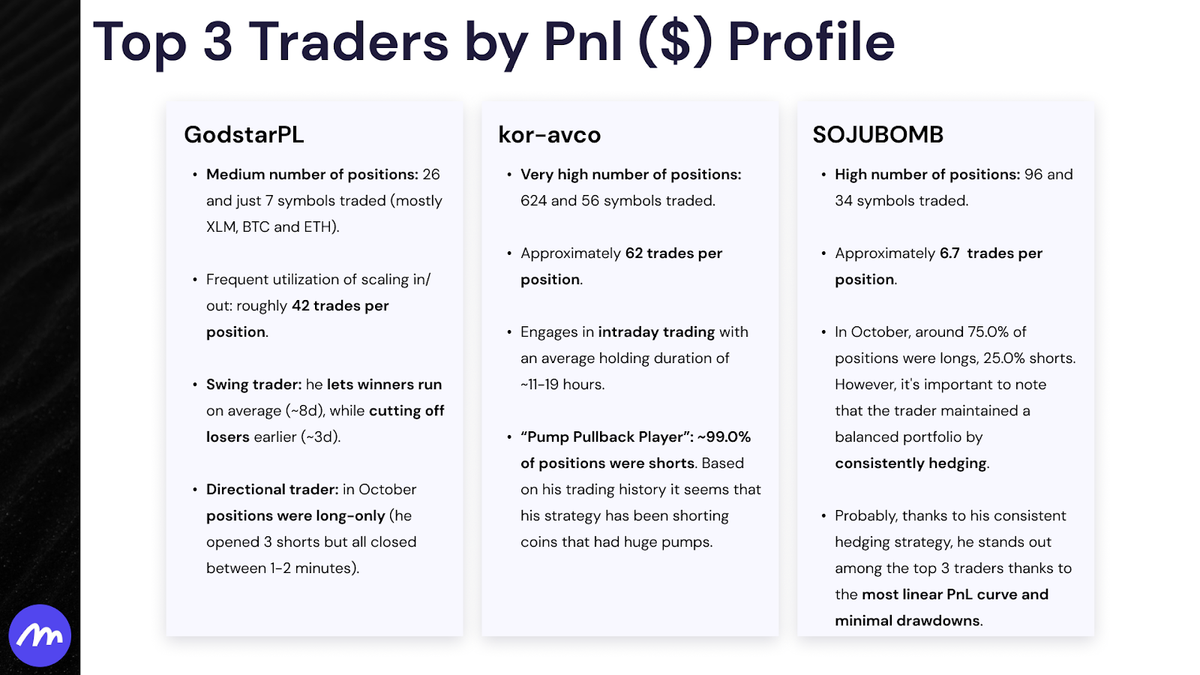 - The market continues to be a diverse ecosystem with numerous trading strategies in play, each attempting to exploit different market edges. For instance, Kor-Avco's October strategy focused on shorting over-extended coins, contrasting with GodstarPL's approach of taking only swing long trades. Meanwhile, SOJUBOMB maintained a constant hedge with both long and short positions, showcasing the variety of strategies employed by top traders.