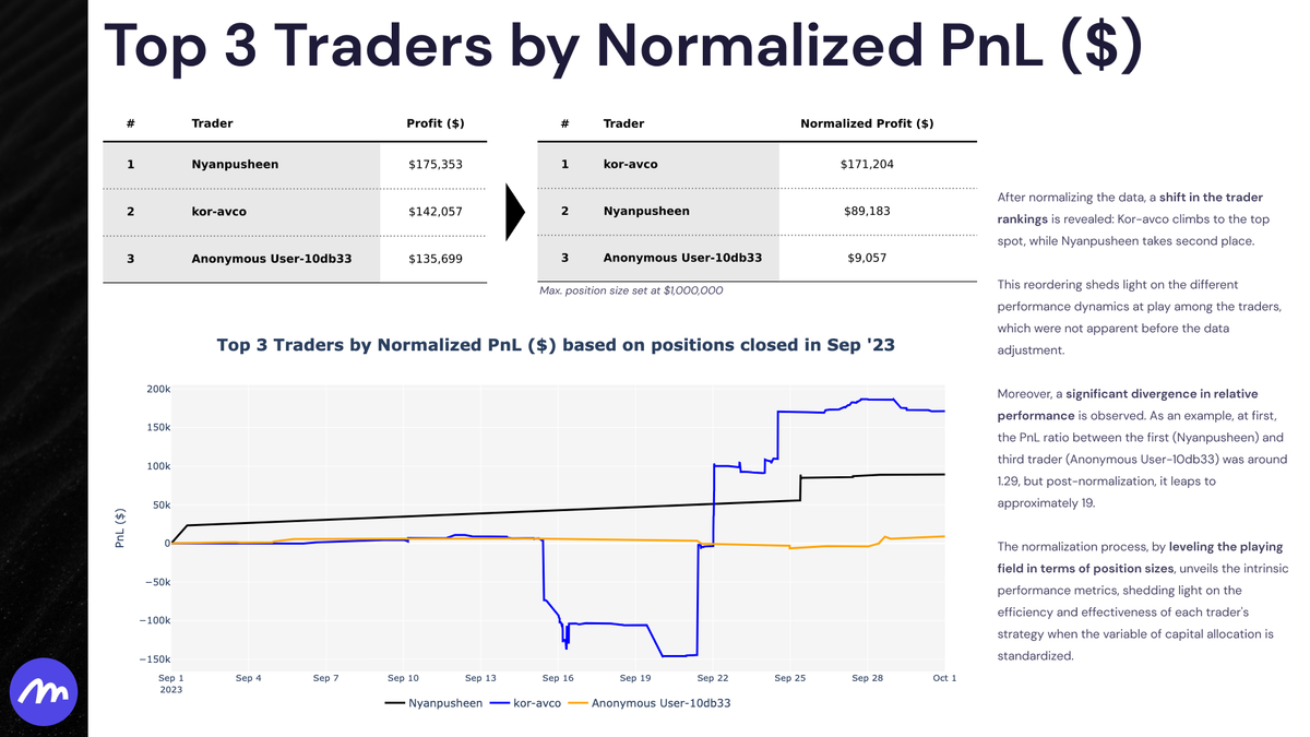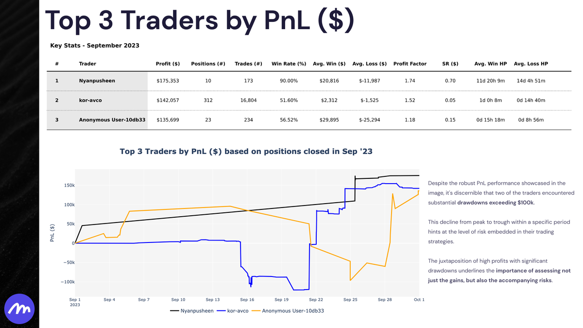 On the leaderboard, profit in USD is the holy grail for traders. So we kicked off this report by examining the Top 3 money-making maestros of September 2023: