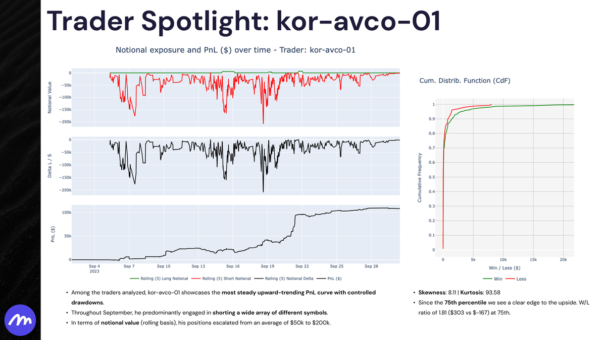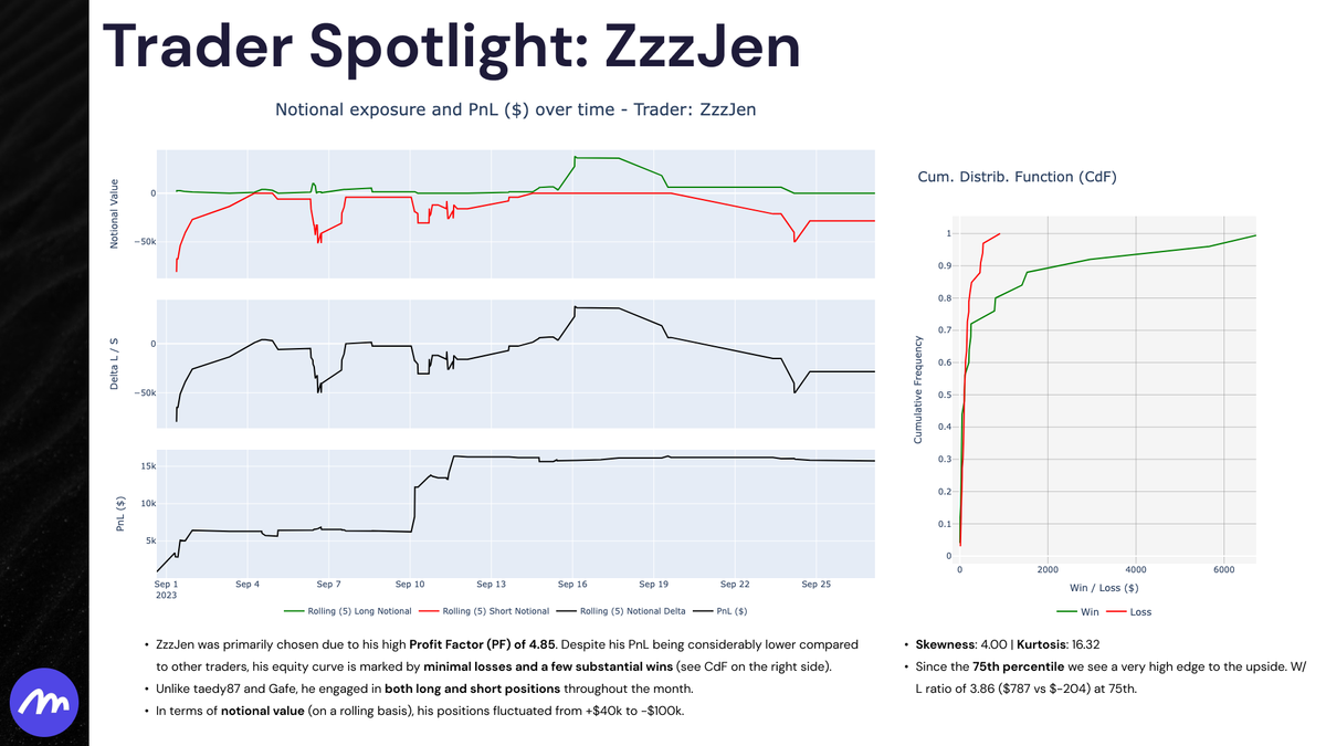 Despite a modest PnL of $16k in Sep '23, he stands out with a high PF of 4.85, showcasing an equity curve with minimal losses and large wins probably due to his PnL distribution.